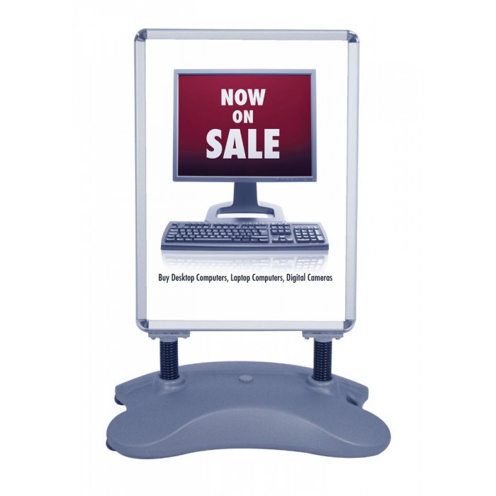 The double sided snap frame holds materials up to 23.25" x 33" and includes glare reducing overlays. Built in wheels make moving the display easy.
